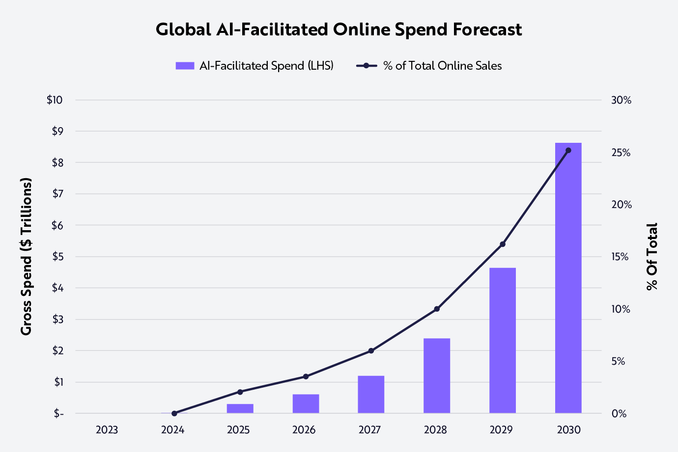 ARK’s research suggests that, by the end of this decade, AI agents could facilitate nearly $9 trillion in global private consumption, growing from little more than zero today. Our estimate includes intermediation at both the application layer, like an AI assistant on a Shopify storefront, and the OS layer, or an all-encompassing personal AI agent. According to our estimates, AI will influence 25% of global online sales of consumer goods and services in 2030, as shown below.
