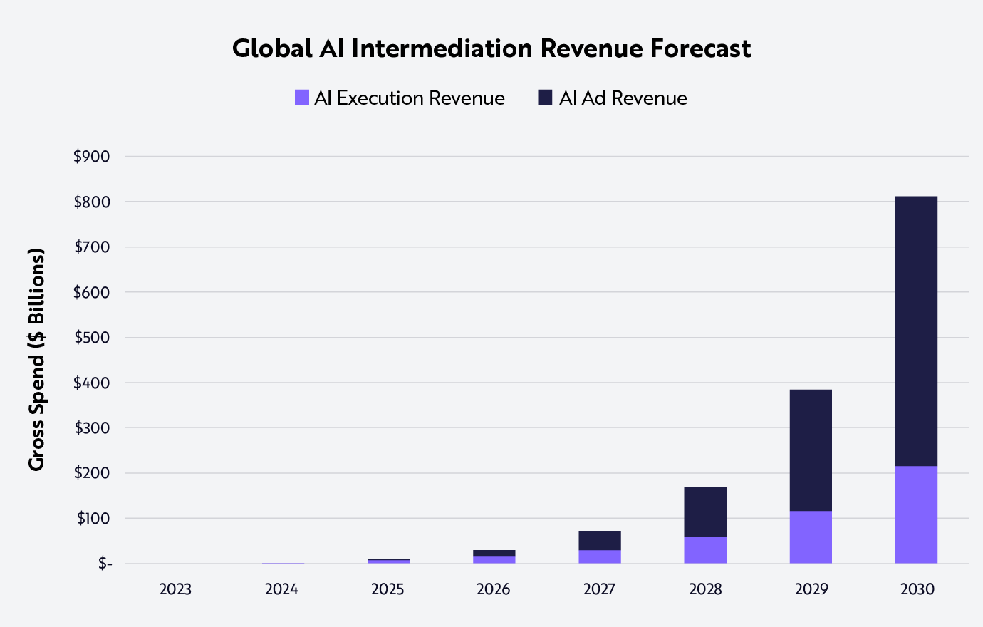 If AI-facilitated ad spend were to approach $9 trillion globally in 2030, AI agents could extract more than $800 billion in total intermediation revenue, up from zero today. The take-rate on purchases could approach 2.5% of revenue, or $220 billion; competition for AI agent-based lead generation could be commoditized, as has been the case in traditional payment processing.