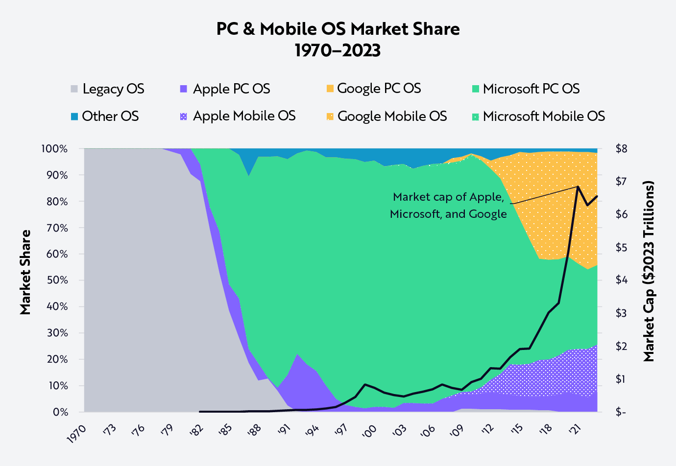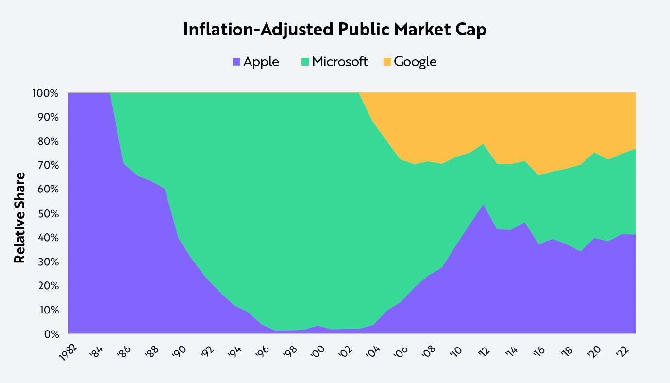 Given the difference between the revenue share and the market cap share of each OS, vertical integration prevailed over the licensing models: Apple commanded 43% relative share of market cap in 2023 compared to Microsoft’s 36% and Google’s 23%, as shown below.