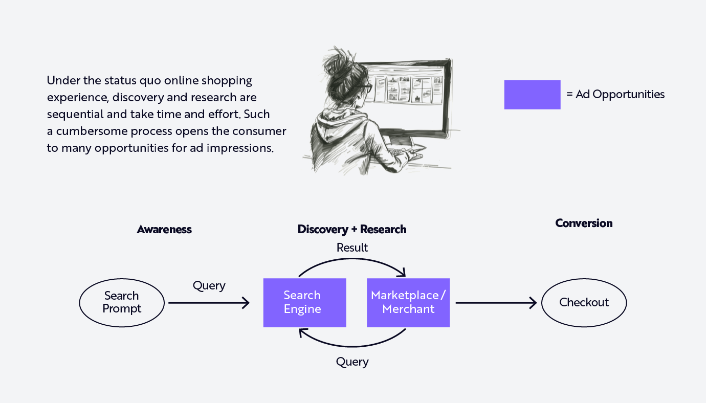 As consumers shop online in new ways, the digital advertising ecosystem is likely to face substantial disruption, across search, display, and marketplace ad spend. Currently, online shopping involves a sequential process of discovery and research through search queries and results. Importantly, that process created opportunities for ad impressions in search results, on marketplace platforms, and on independent websites across the open web, as illustrated below.