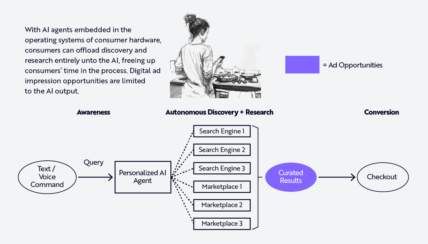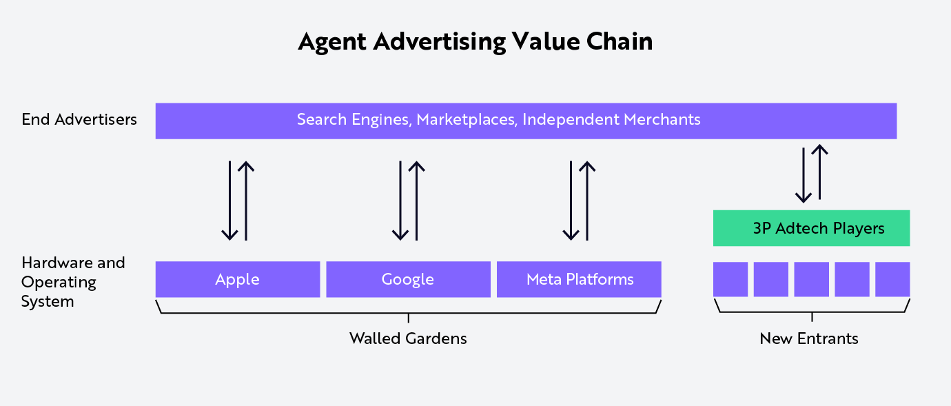 With increased demand for AI wearables, third-party adtech platforms could benefit disproportionately by aggregating agent-derived ad supply. Importantly, search engines, marketplaces, and independent merchants are likely to compete for space inside the curated output of OS-level AI agents, as illustrated below.
