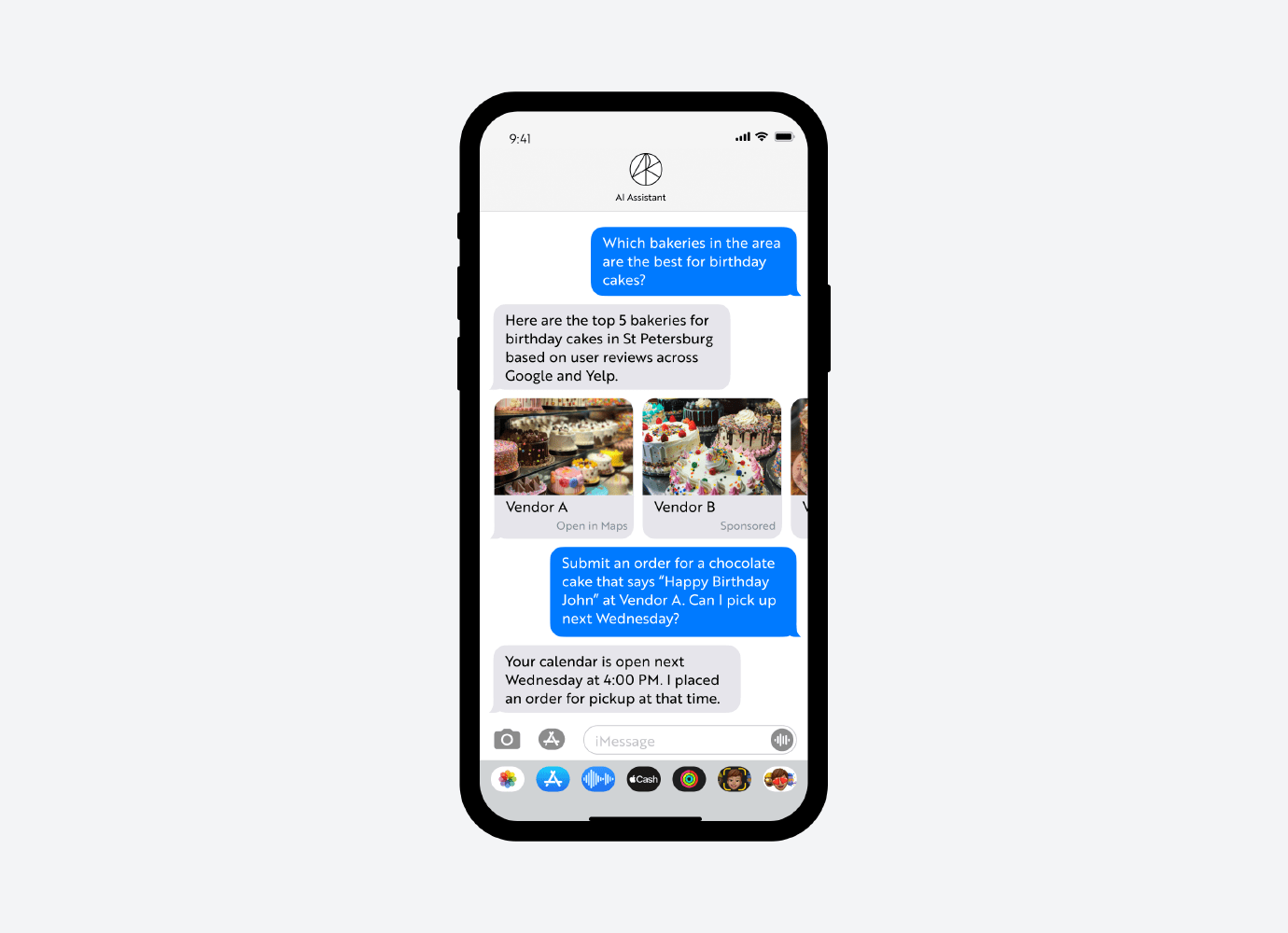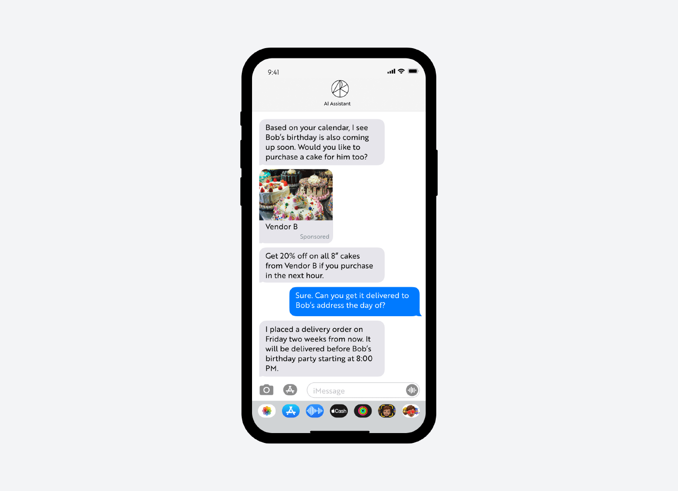 Based on the information that OS-level AI agents access across authorized data sources, active intent-generation will be possible only with OS-level AI agents that personalize recommendations based on information that consumers are willing to release about their behavior across the internet and applications. The image below continues the fictional journey depicted above, with subsequent purchase opportunities based on the context provided by consumer calendars. Here, the AI agent presents a discounted offer on a birthday cake for another person’s party registered in the user’s calendar.