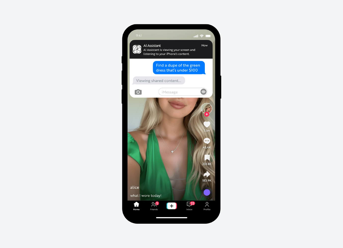 Source: ARK Investment Management LLC, 2024. The above illustration was generated and assembled by ARK using Midjourney and Figma. The image illustrates a smartphone user interface in which the user is sharing her screen and audio to an AI assistant real-time, instructing the AI based on the content seen on a short-form video app. For illustrative purposes only.