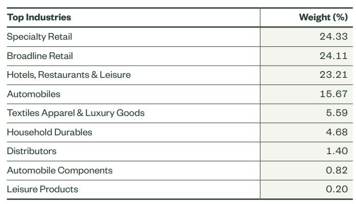 The fund that is closest to this for comparison purposes is the Consumer Discretionary Select Sector SPDR Fund (XLY). This fund delivers more or less the same consumer discretionary exposure as FDIS. The top 10 positions and weightings are pretty much identical.