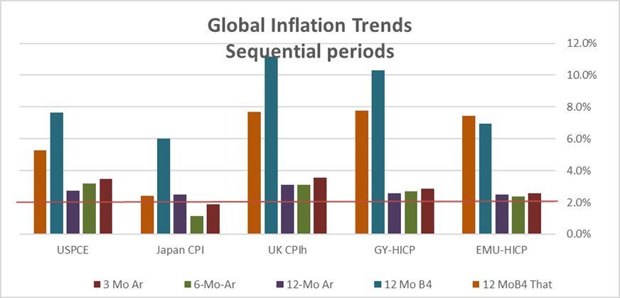 Central banks remain somewhat mesmerized by their year over year inflation progress and how much inflation has fallen how low its pace is over the last 12 months compares to what they faced over the previous two years. There’s no denying that the progress has been sharp. On the other hand, there’s no denying that central banks have still not attained the target that they have established and that they seek. And so there is tension between these two developments, one that shows a sharp reduction in the inflation rate, the other, that shows ongoing stubbornness and some acceleration for inflation from 12-months to six-months to three-months – amid still excessive inflation.