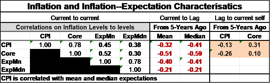 What I have long rejected is the idea that any point forecast of inflation expectations is meaningful. I do believe people have some sense that inflation expectations have risen or fallen and that inflation risks have risen or fallen but I don’t think we can put a precise number on it and that’s a problem for anyone that wants to use statistical analysis to solve this problem. On the other hand, what we do see is that expectations are formed with the significant correlation to what inflation has been. Those are the correlations and the current panel of the table; we know that to some extent inflation expectations are extrapolative. And this is why it in fact has been quite useful to judge monetary policy by looking at interest rates relative to trending inflation because while that doesn’t tell you what inflation is going to be in the future it gives you an idea of the breaking effect. But let’s also realize this is not clear cut. If inflation has been very high and begins to be controlled, it is likely people will be looking for lower inflation in the future not the kind of inflation they have today or had over the past year. But until inflation breaks lower it is unclear how much weight people would place on high inflation falling. Right now even after inflation has broken lower inflation expectations have risen and are moving higher- that is not good news.