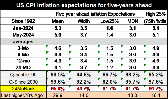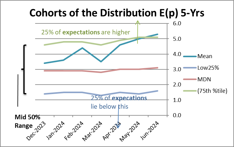 The more closely we look at the facts and the needs of the economy and the more we look into the future… even though it may be that expectations aren’t well formed about the future… we can see certain risks beginning to well up that are going to need to be dealt with that clearly should be elevating inflation expectations. Against that background, the rise in the mean expectation makes sense to me. The stability of the median expectation makes much less sense to me. We have increasingly unstable geopolitical conditions. The US has committed to support Taiwan. China, having claimed the South China Sea, a claim that is unsupported by the World Court and by all except China’s closest allies, has become more aggressive in asserting its claim. There are various archipelagos in the South China Sea; those territories are much closer to the areas that China claims and that have traditional claims or interests upon these waters. There are now clashes with China there. The flare up in the Middle East demonstrates that conditions there could get much worse. There is an outright war between Ukraine and Russia. Clearly, the transition from Post post-war to Cold War, to a more peaceful transition has ended. Whatever the peace dividend was, it is no more and now America, Europe, Japan—everyone—will be boosting their military budgets. This will put strain on deficits, and this is going to raise the risks of inflation. At the same time there has been less commitment to free trade, and international trade, the US now has some high and long-standing tariffs against China, and it is unclear whether we are going to continue to go farther down the road of protectionism or not. But there’s little in the way of international trade developments that are likely to bring more price discipline and much more that’s likely to bring less price discipline. Inflation risks are rising!