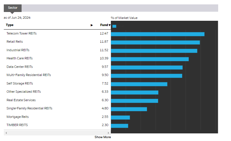 The only vague category is industrial REITs. We believe that the majority of that exposure is covered by just one REIT, Prologis (PLD), which is this ETF’s largest holding at 8.28%. Prologis is a logistics real estate REIT which rents out to logistics companies as tenants. It’s relatively resilient since there is secular growth in ecommerce, but it is going to be sensitive if a deep downturn happened.
