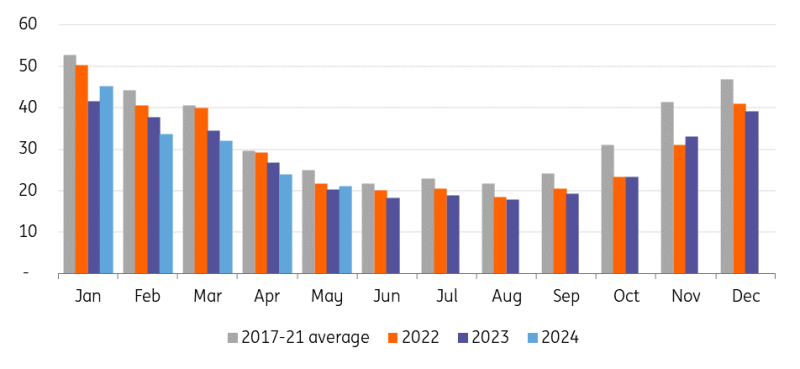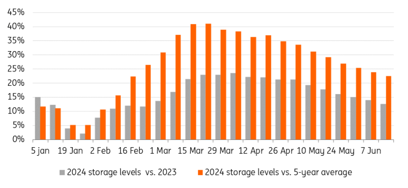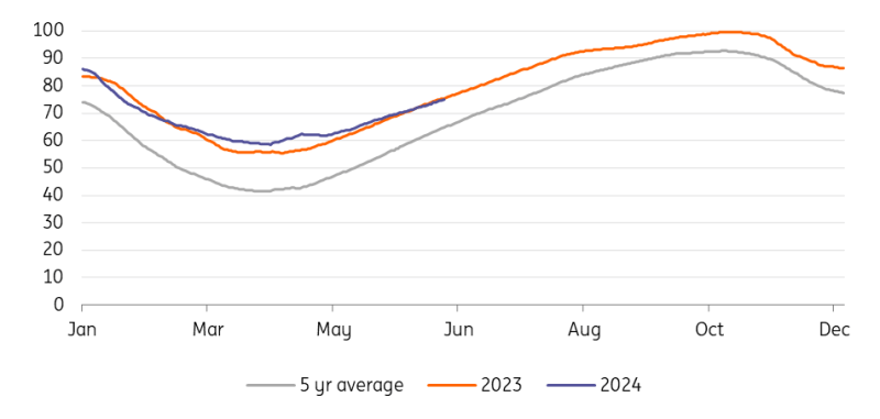 EU gas storage remains comfortable at 75% full, which is well ahead of the five-year average of 65%. The pace of net injections over May and so far in June are below levels seen during the same period last year. However, with net injections averaging 250mcm/day from the start of May through until 18 June, the EU is still on track to hit full storage ahead of 1 November, assuming net injections remain around similar levels. However, injection levels are going to largely depend on LNG imports, which have been under pressure, and on how Russian pipeline flows evolve through the summer, considering the risks that continue to hang over this supply.