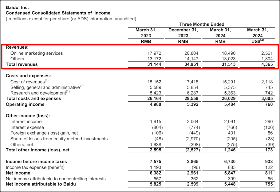 Baidu’s online marketing business, which consolidates the firm’s efforts to monetize its dominant Search market position in China, generated 18.5B Chinese Yuan ($2.56B) in revenues in the first fiscal quarter, showing a year over year growth rate of 3%. While the growth rate is in and of itself not spectacular, Baidu is making solid progress in its core business and seeing decent operating income tailwinds as well. In Q1’24, the technology company had operating income of 5.48B Chinese Yuan ($760M) which showed a Y/Y growth rate of 10%. In other words, the company’s operating income grew at 10X the rate that its revenues grew in the first-quarter.