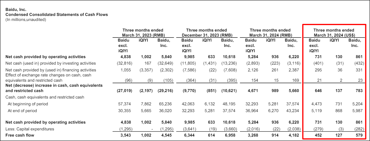 Baidu (NASDAQ:BIDU) is a highly profitable Chinese large-cap investment in the tech industry. Although Baidu delivered a decent earnings sheet for the first fiscal quarter, persistent investor skepticism with regard to Chinese tech companies continues to prevent a revaluation of Baidu’s shares. Baidu saw continual recovery gains in the digital advertising market in Q1’24 and is generating a ton of free cash flow, which in part is now being contributed by the company’s popular video streaming platform iQIYI. The company’s significant free cash flow, continual core business growth and potential for stock buybacks makes Baidu an attractive long term bet!