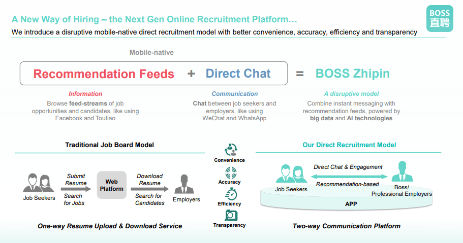 The way online recruitment platforms have always worked has been to separate the two parties involved: employers (the client) and jobseekers. Employers post ads for open positions, and jobseekers post their resumes. Hiring managers assigned to the task have to download and screen the resumes one by one and assess whether the candidate is a good fit. More often than not, it is impossible to know if the candidate fits what the employer is expecting, as the resume does not tell everything. As such, the process has to be replicated multiple times, with multiple interviews involved. In other words, this is a very inefficient business model, but because it is still better than handing out flyers or pasting job ads on physical notice boards, adoption has been healthy. I believe BZ’s disruptive business model is going to enable it to win share from legacy online recruitment platforms.