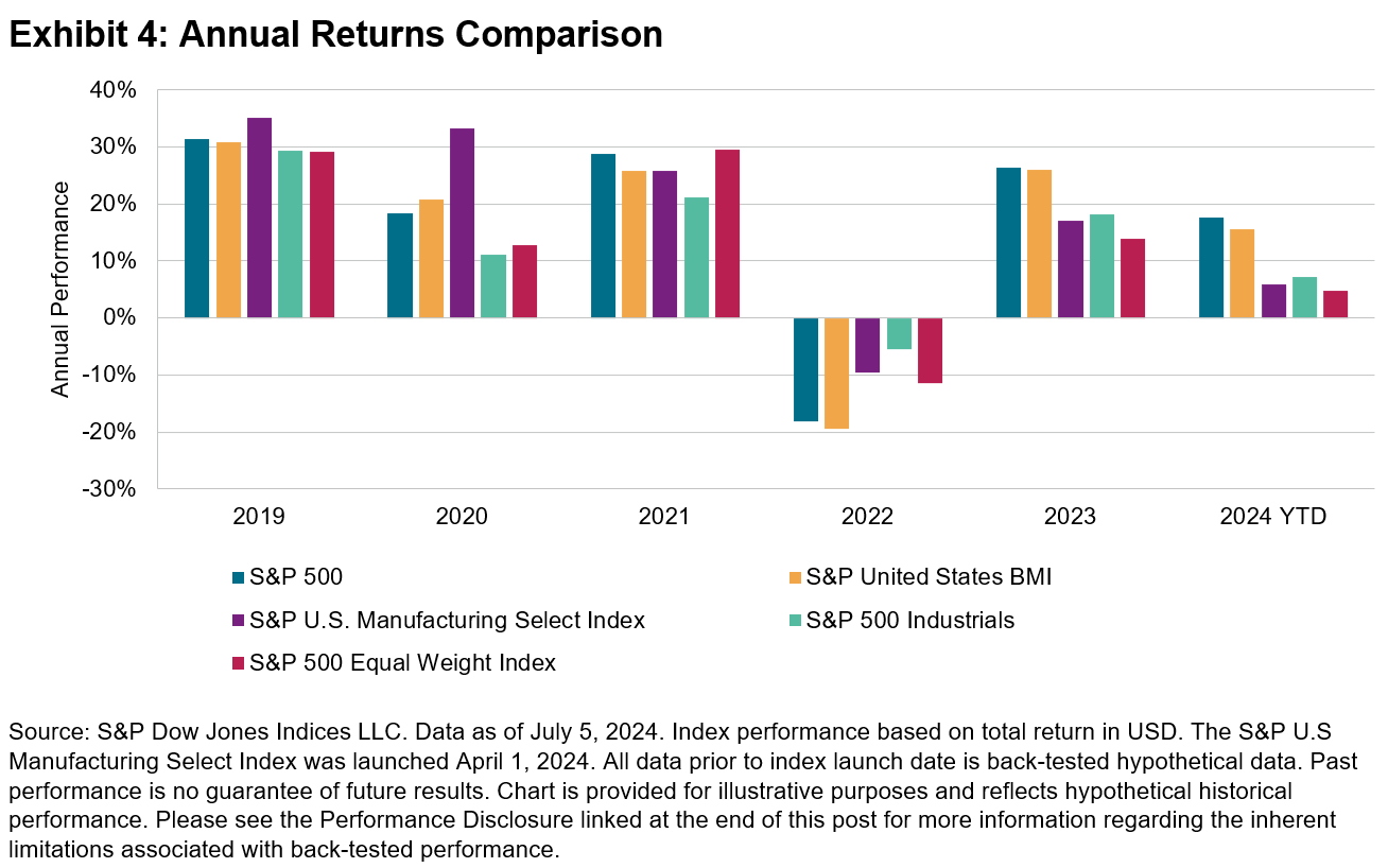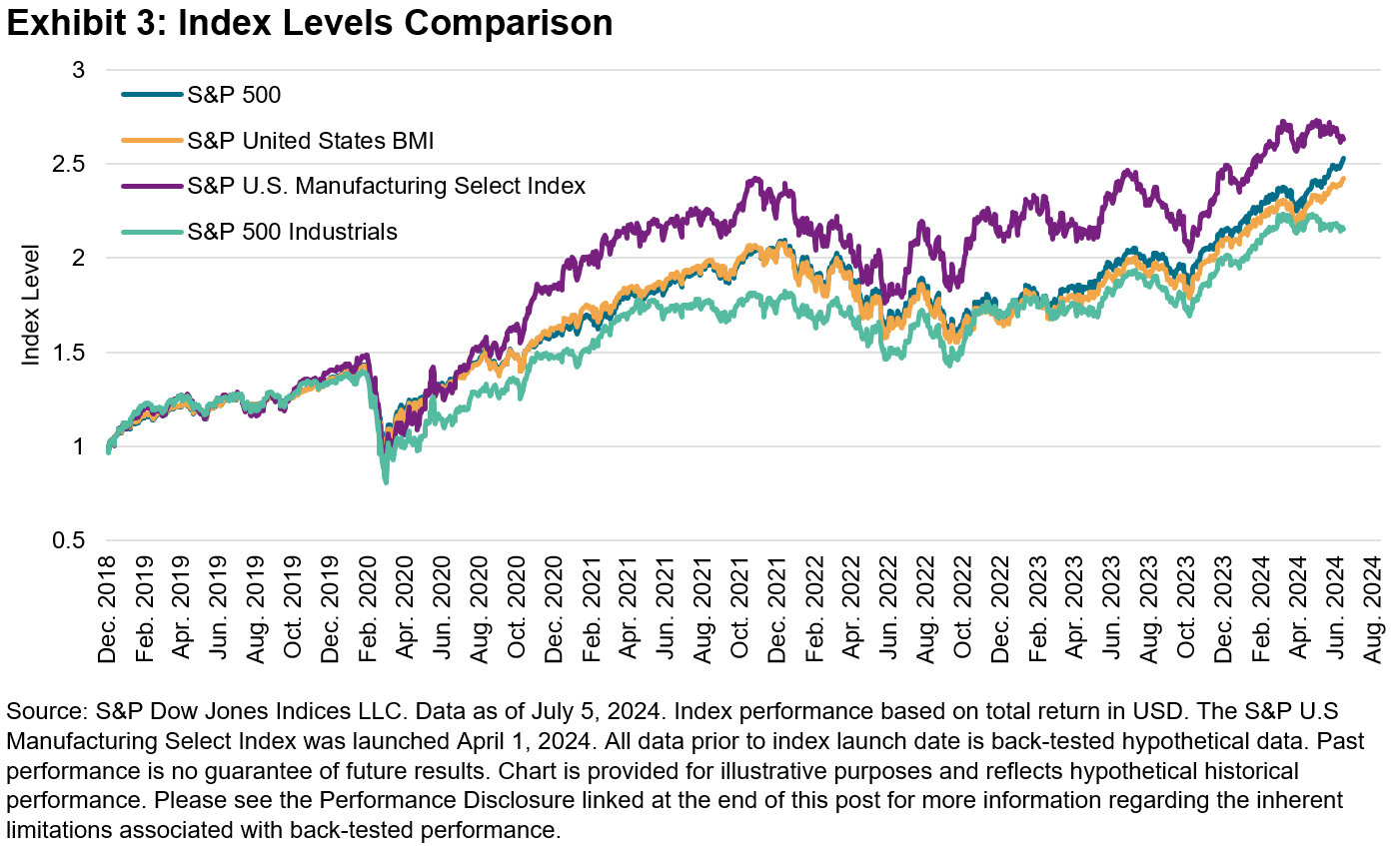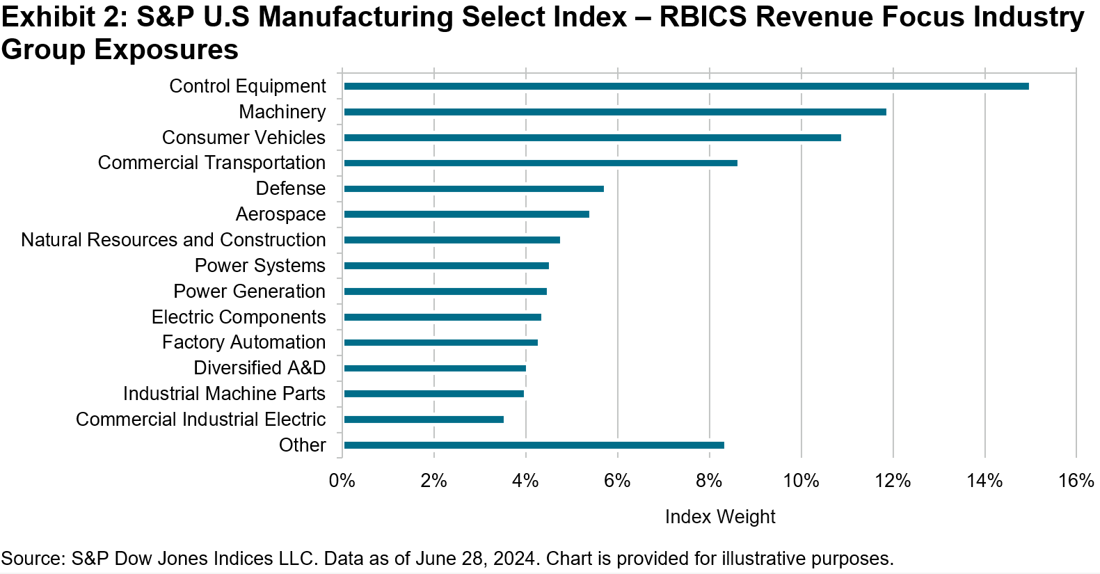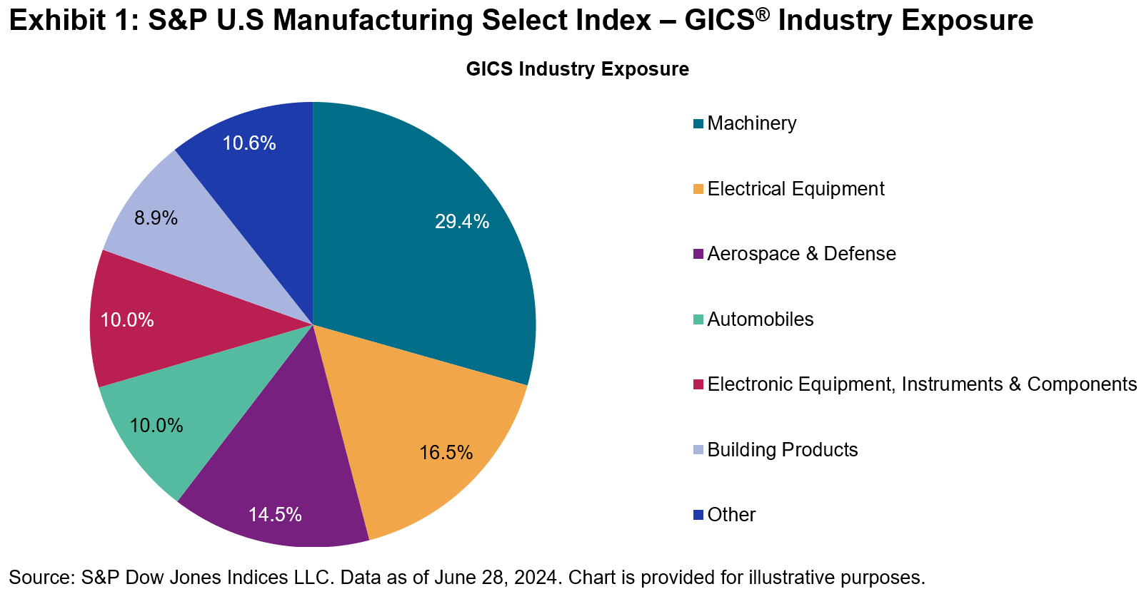 The S&P U.S. Manufacturing Select Index was launched in April 2024 and tracks U.S.-listed companies that have a significant portion of their revenue sourced from U.S. markets, and whose revenue streams fall into one of the 11 industry group categories as defined within FactSet’s Revere Business Industry Classification System (RBICS) Focus framework. The index is weighted using an adjusted float-market-cap approach, optimized for constraints to provide constituent-level and RBICS category-level diversification.