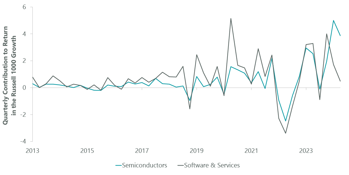 A number of deals slipped at the end of this year’s first quarter, including several large deals for the larger SaaS vendors. This followed a stronger fourth quarter of 2023 that had caused some industry watchers to extrapolate that trend into 2024. Enthusiasm over the benefits of generative AI and pressure to keep up with competitors has led enterprises to reprioritize IT budgets, leading to a pause in software spending that has shown up in performance dispersion within the IT sector (Exhibit 2).