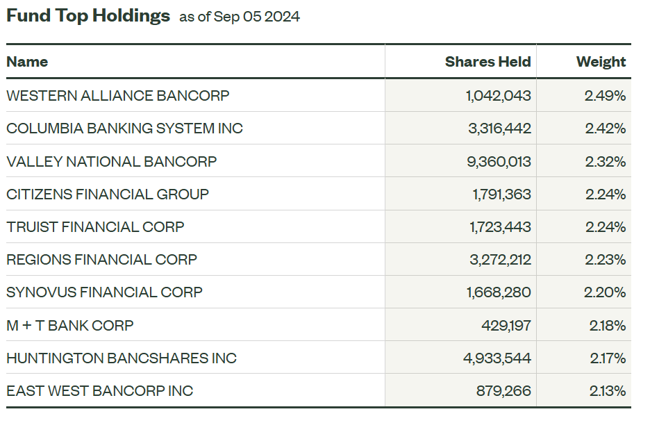 The top five holdings can change, but they include some big names in regional banking. These banks are key players in their local areas. They offer all sorts of services, from personal accounts to loans for small businesses.
