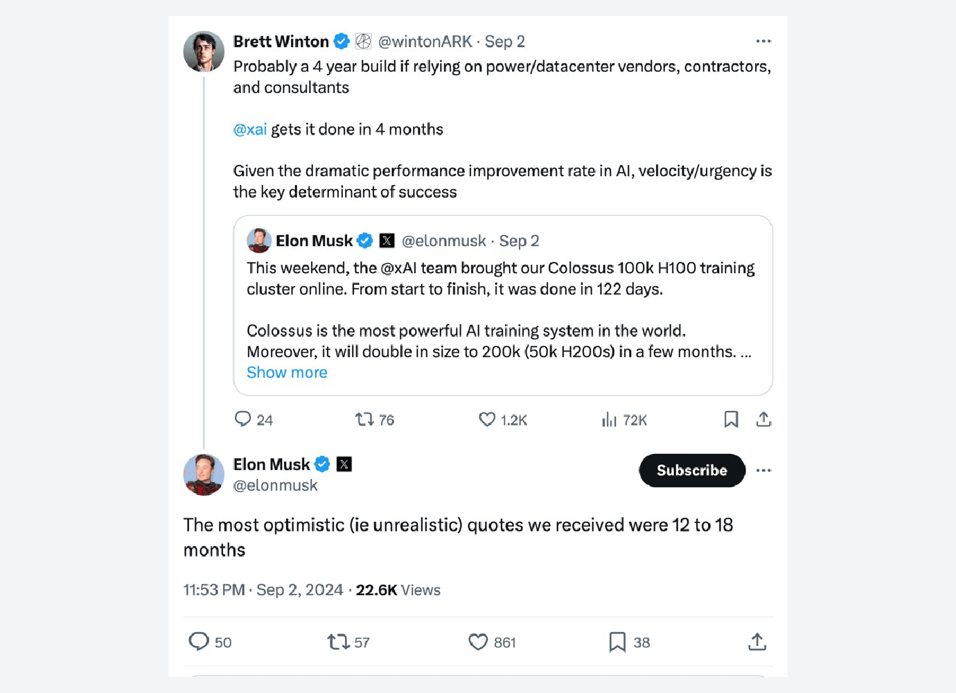 - 4 Winton, B. 2024. “Probably a 4 year build if relying on power/data center vendors…” X. Musk, E. 2024. “This weekend, the @xAI team brought our Colossus 100HK H100 training cluster…” X.