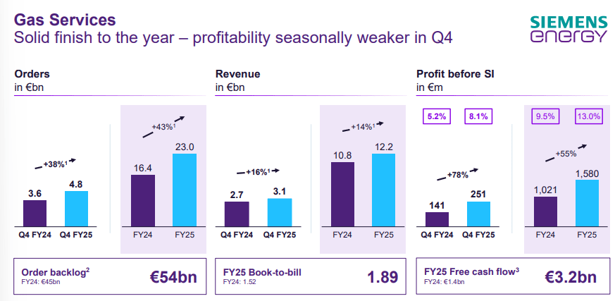 Siemens Energy is a global energy technology leader with 4 business segments that span the electricity value chain. First is Gas services [GS] which builds gas turbines and gas fired power plants. These are the big machines keeping the lights on from the US to the Middle East. And this is Siemens Energy’s cash cow and backbone. For instance, in 2025 GS delivered €1.6 billion profit at a 13% margin.