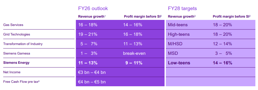 I am giving Siemens Energy AG (OTCPK:SMNEY) a Strong Buy. And this is because, in my view, the company is a rare all rounder that is positioned to lead the global energy transition, and do so profitably. Siemens Energy has solidified a foundation of growth especially after a record €138 billion order backlog. And, it is now entering an acceleration phase of margin expansion. In 2025, revenue jumped 15% with profit margins up by 500 bps y/y. Management upgraded both near term and mid term targets as shown in the figure below. In 2026 the management has guided between 11% and 13% revenue growth and between 9% and 11% profit margin. On the other side, the company aims for growth between 14% and 16% margins. This is more than 2x the current margins within 3 years. And in other words, Siemens Energy is turning scale into earnings.