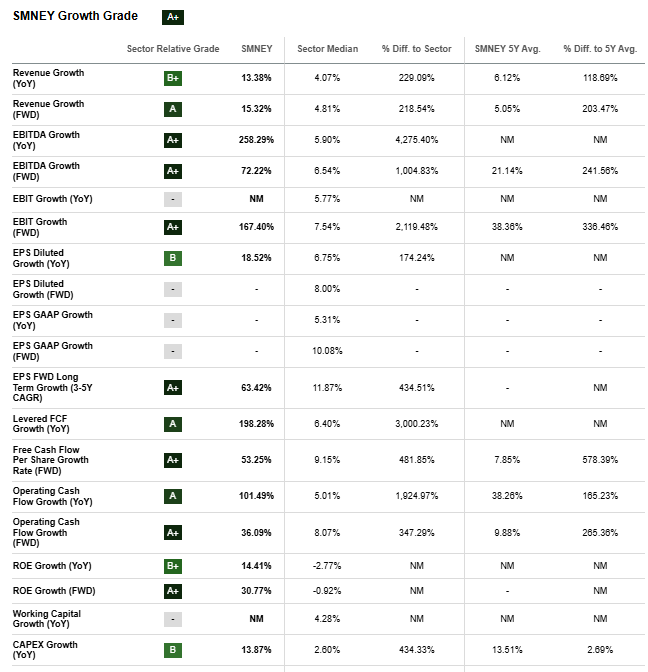First I note that SMNEY scores an excellent A+ growth grade as shown below. Specifically, I note that the FWD Revenue growth of Siemens Energy stands at 15.32% while the sector median stands at 4.81%, implying an outperformance to the sector.