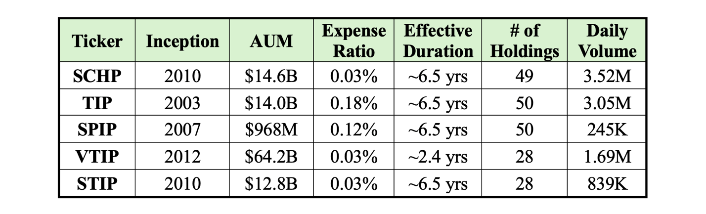 For this discussion we’ll limit the comparison to ETFs, where there are a handful of large, low-cost options. SCHP’s closest peers fall into two groups: