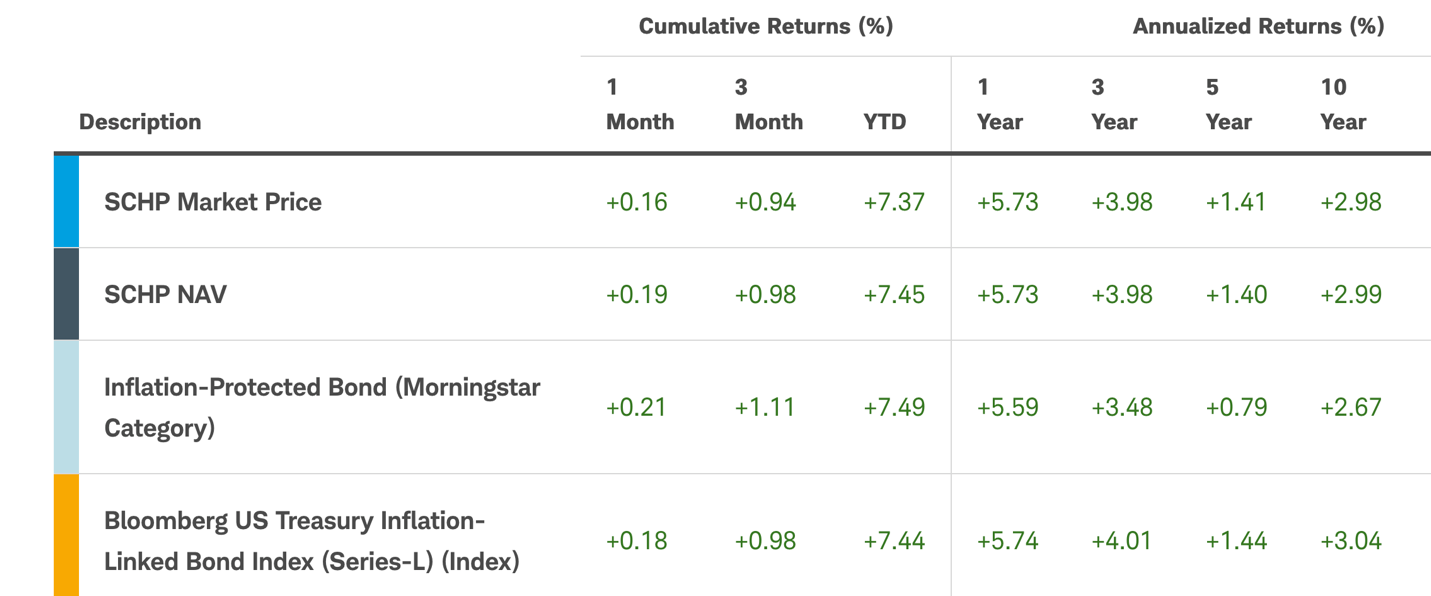 During a slowdown or in mild inflation: SCHP can lag traditional Treasury funds since falling nominal yields favor fixed-rate bonds. That said, TIPS have a built-in floor: the bonds won’t repay less than their original principal at maturity. This offers protection in severe disinflationary periods.