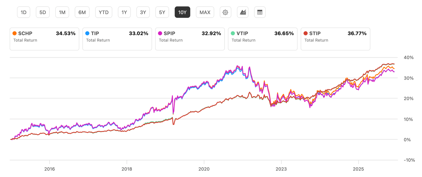 iShares TIPS Bond ETF (TIP): Tracks the same Bloomberg index as SCHP, so any portfolio differences are minimal. The main difference is cost: TIP charges 0.18% vs. 0.03% for SCHP. Over a decade, that compounds to a ~2.3% return gap. But since 2015, SCHP has only outperformed TIP by about 1.5%. TIP actually won at the portfolio level but its higher fee more than offset that advantage.