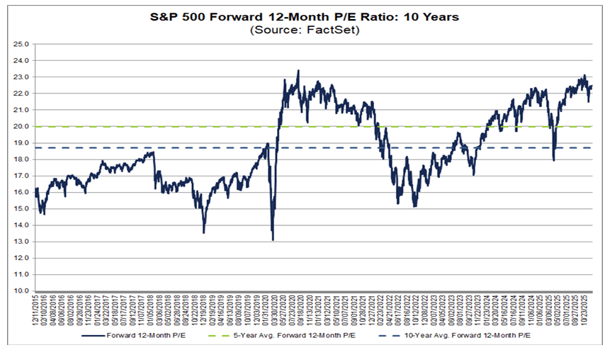 While earnings growth is expected to be robust, it is difficult to argue that stocks are cheap. The market is trading at ~22.5x forward earnings, which is above both its five- and 10-year averages. We only saw the market trade at a higher forward multiple during the COVID pandemic. Of course, during recessions, markets tend to have higher multiples as near-term earnings are depressed. To be near a peak multiple while also at record earnings is less typical. Now, elevated valuations can persist for longer than anticipated, and as such, I generally avoid sell recommendations based solely on this, but it clearly should be a source of caution for investors.