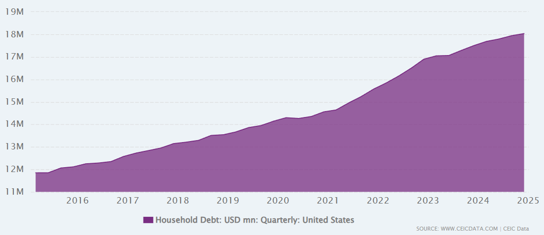 - Personal debt/credit: up. U.S. household debt is continuing to rise. While this might not be good for consumers in the long-run, it is certainly helping to buoy consumer spending, which is helping companies generate profit and sustain hiring. Only when the chickens come home to roost will the rising consumer debt become a problem on a structural level, and I do not necessarily see a catalyst for that happening just yet. Rising debt also helps banks and financial stocks as much of their revenue is tied to consumer lending and interest payments.