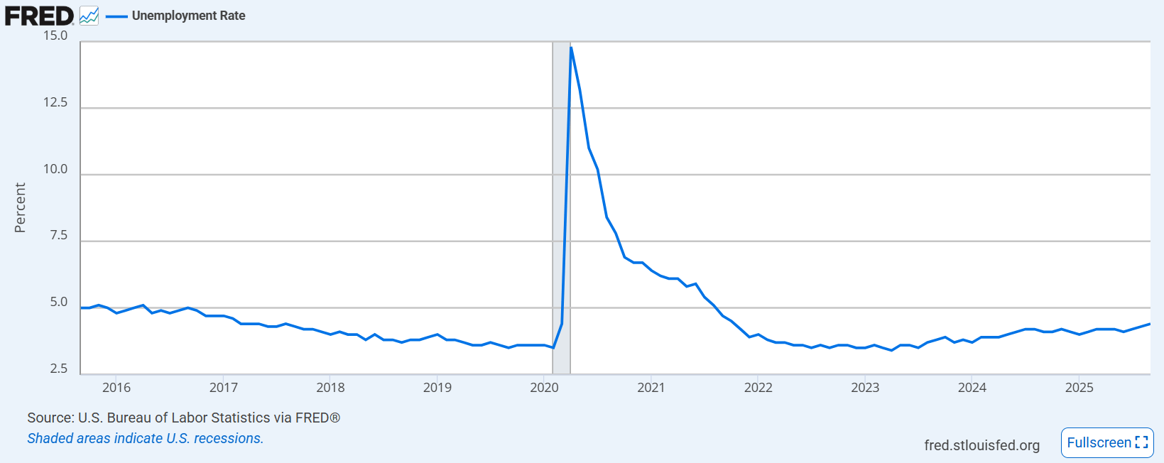 - Unemployment – up. The U.S. unemployment rate is trending upward since 2023, but is still low by historical standards. Only if this were to continue rising above, say 6%, that the stagflation fears sparked earlier in the year might resurface. Moreover, rising inflation is often seen as a catalyst to reduce interest rates and spur growth. The Federal Reserve has this option up their sleeve. If interest rates were below 1% and unemployment was rising, we’d be in trouble as the Federal Reserve would have fewer levers to pull.