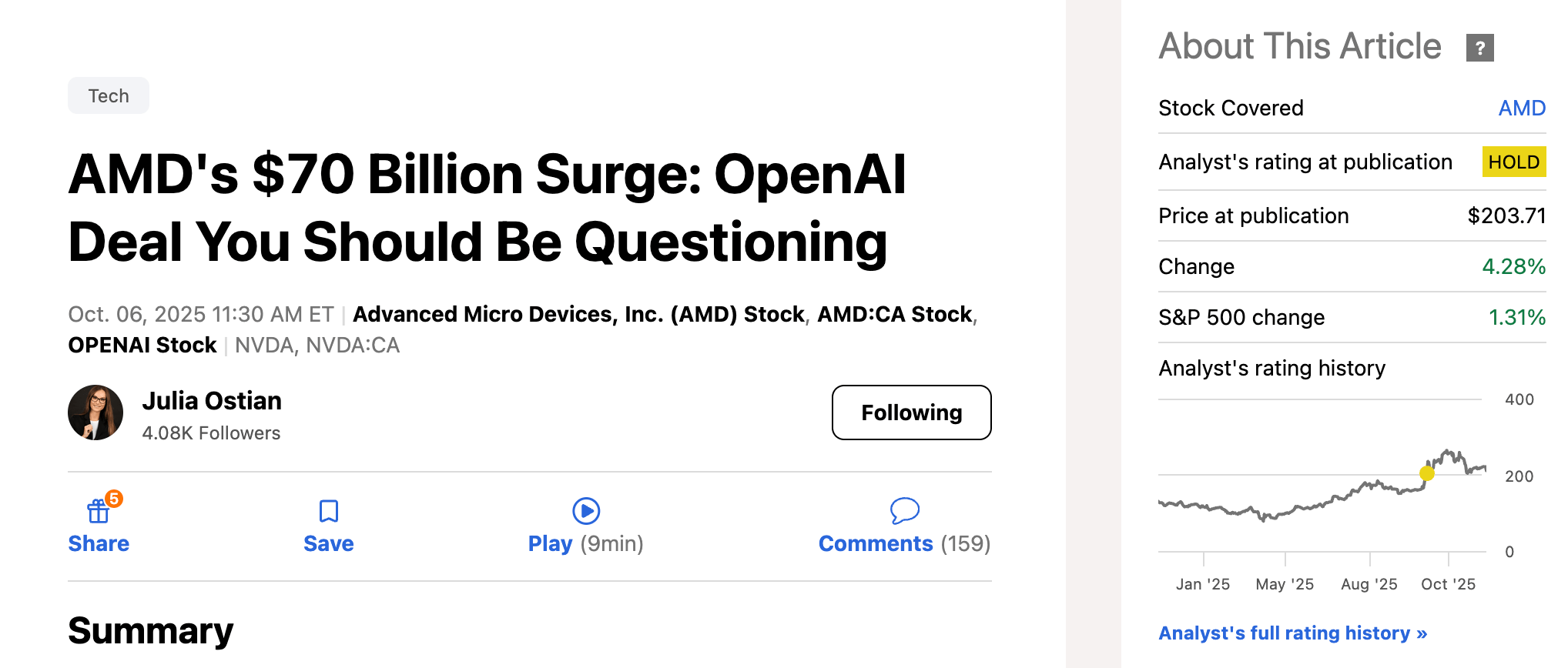 What has been happening around OpenAI lately, with its simultaneous contracts with Nvidia, Oracle, Broadcom, and now AMD, has started to look like an inflated web of promises built on circular financing. The financial engineering behind it starts looking fragile, and I am not sure OpenAI will be able to stand up to all of those promises.