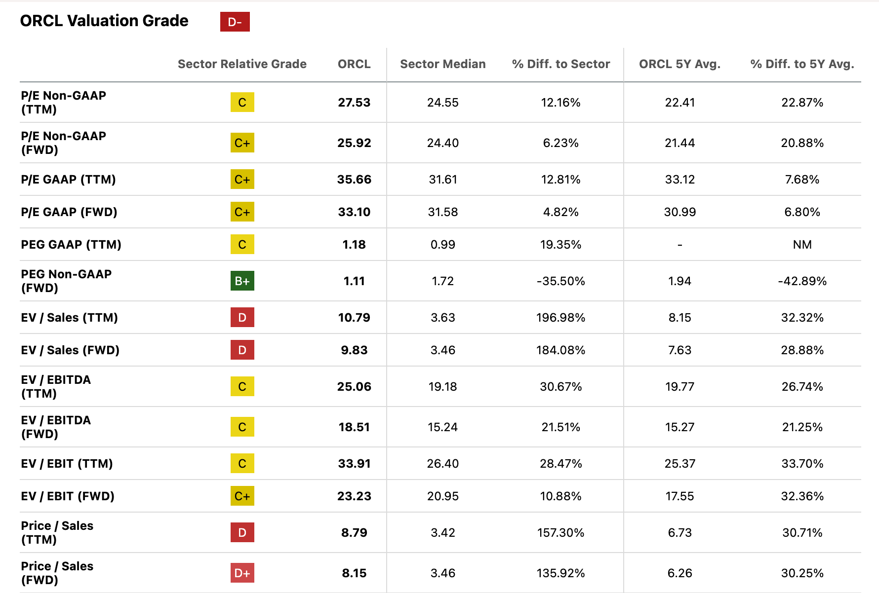 If we take a look at Oracle’s valuation metrics over the last three years, we see that the company is finally not that expensive relative to its own history. The lowest trailing 12-month P/E ratio in this period was 25x, while the highest (during the peak of the recent mania) reached 76x. Right now, we are sitting at about 35x. It is not the lowest level, of course, but it is a significant retreat from the highs.