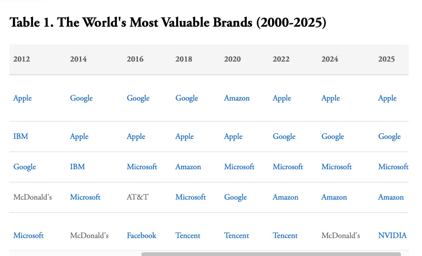 [Sourced from Kantar (Top 100 Most Valuable Global Brands) and Mendonca, Pereira, Godinho (2004). Rankings for 2020-2025 based on Kantar BrandZ valuations.]