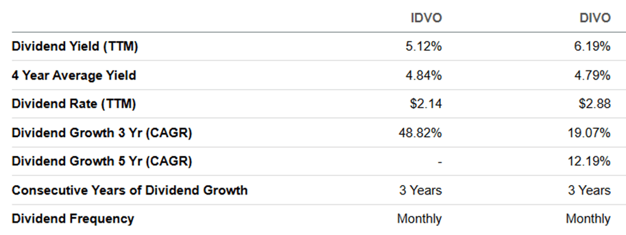 - These funds have a similar dividend policy with monthly payments, making them convenient for retired investors who live off such dividends. Yields differ by 1.07%, but IDVO’s average annual dividend growth rate is more aggressive than DIVO’s. This does not, though, mean that their dividend policy concepts are any less similar.