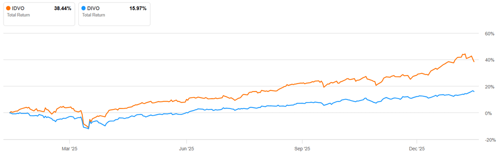 - These funds’ teams follow an active management style rather than just blindly copying any indices. Stock selection is done manually, and so is the decision-making on option hedging. That’s what lets IDVO and DIVO be flexible when markets are super volatile.