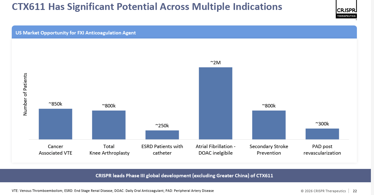 CTX611 is their most advanced candidate. This is a factor XI siRNA, a long-acting anticoagulant that uses small interfering RNA to knock down the production of clotting Factor XI in the liver, aiming to prevent thrombosis without causing significant bleeding risks. It is in an ongoing Phase 2 clinical trial in patients undergoing TKA (total knee arthroplasty), but with multiple indications seen as possible: