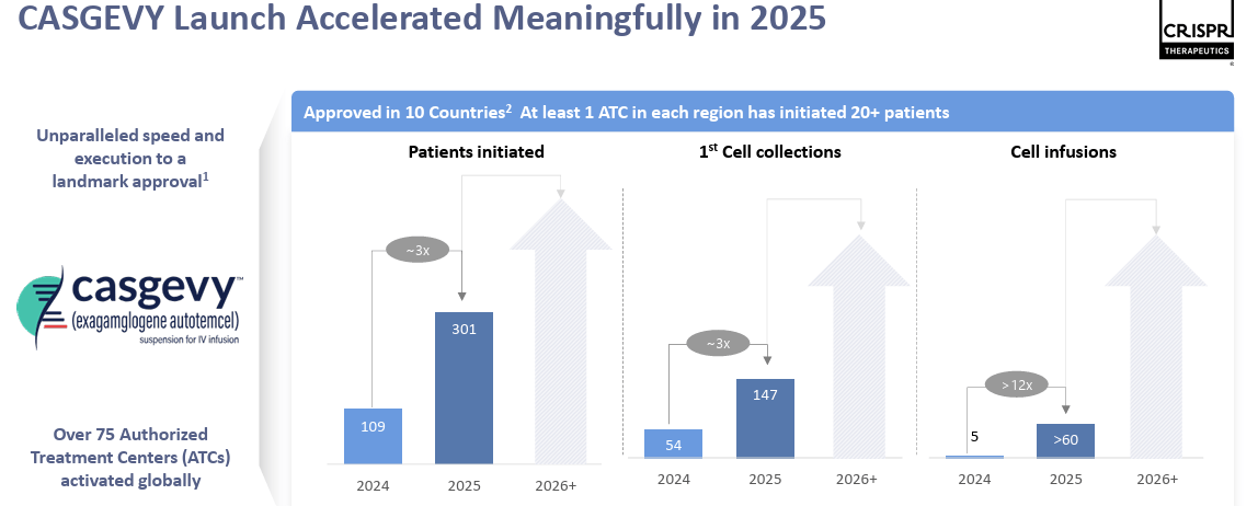 Launched in 2024, CASGEVY accelerated meaningfully in 2025, with infusions occurring in all regions (US, EU, UK, Middle East) for both SCD and TDT: