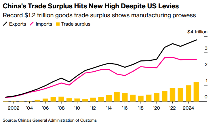 The result was China posting a record-breaking trade surplus that exceeded $1 trillion for the first time. Additionally, China’s strong export performance was aided by cost advantages in its manufacturing sector (a depreciation of the real exchange rate, consistent with domestic deflationary pressure), which allowed China to offer lower export prices.