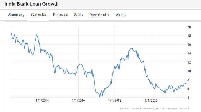 印度金融业的表现将对 IFN 起到相当重要的作用,因为它占投资组合的最大份额。如果我们查看印度银行的总贷款增长趋势,我们可以看到,自大流行爆发以来,该指标往往在 5-7.5% 的区间内波动。令人鼓舞的是,在 2021 年下半年,我们也看到了不错的连续进展,最近几周贷款增长达到 7.3% 的水平。尽管如此,鉴于该国的增长潜力(7-9% 水平),您希望看到该国倾向于更高的信贷渗透率,贷款增长接近两位数水平。如果贷款账簿没有两位数的增长,您可能会从收费收入或银行的国库收入方面要求过多,以帮助缓冲收益。