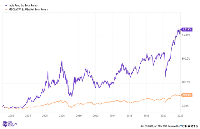 Aberdeen Asset Management 的印度基金 ( IFN ) 是最杰出的投资产品之一,它提供对世界上增长最快(如果不是增长最快)主要经济体之一的访问权。该基金已经存在了很长时间,将近 28 年,并且一直是非常可靠的 alpha 生成源;在过去的二十年里,它的表现远远超过了 MSCI ACWI ex USA 指数——一个涵盖来自 49 个国际市场(包括 22 个发达市场和 27 个新兴市场)的 2,300 多只大中型股的全球指数。