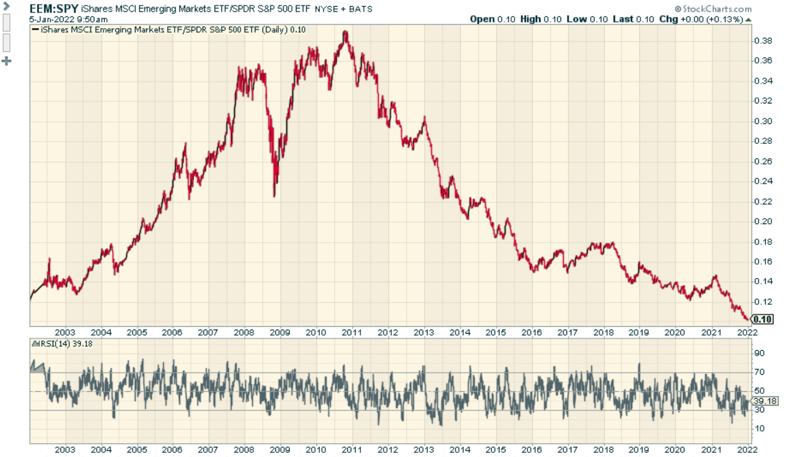 正如我在领先滞后报告中提供的数据表所强调的那样,新兴市场在过去一年左右不得不接受它,并且表现落后于欧洲、大洋洲、远东和外国房地产投资信托基金。事实上,衡量新兴市场和 SPY 实力的比率已经跌至前所未有的水平!
