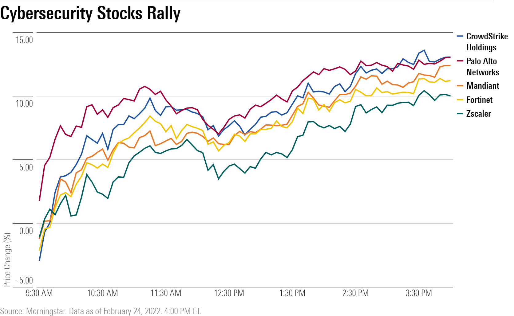 Crowdstrike ( CRWD ) 和 Palo Alto ( PANW )收盘上涨 13%。Fortinet ( FTNT )、Mandiant ( MNDT )和 Zscaler ( ZS )周四均上涨 10% 或更多。Okta ( OKTA )上涨 8.8%,Check Point Software ( CHKP )收盘上涨 6%。