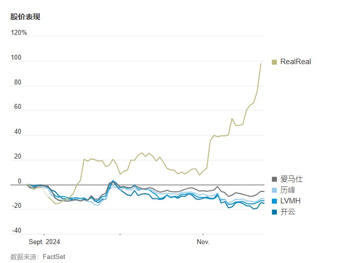 二手市场正赢得一些顾客的青睐,他们仍想买顶级奢侈品牌,但不能接受品牌店内的定价。自2019年以来,二手奢侈品市场的增长速度是一级奢侈品市场的三倍。股价表现数据来源:FactSetSept. 2024Nov.-40-20020406080100120%RealReal爱马仕历峰LVMH开云