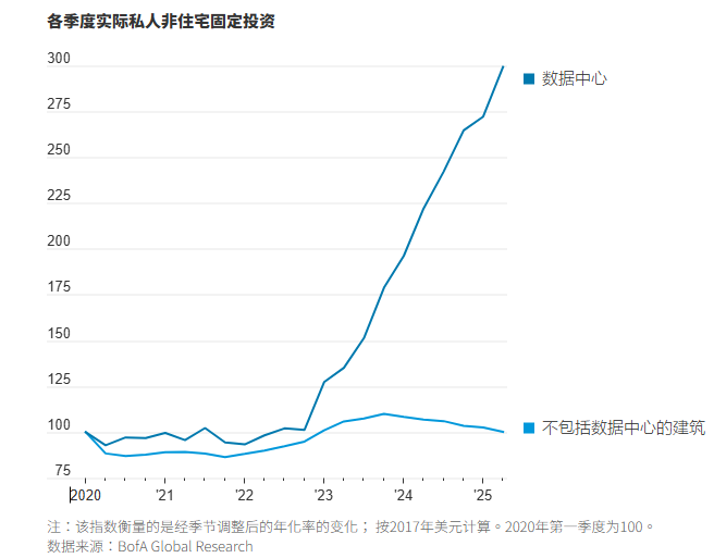 若剔除AI支出,经济状况会更显糟糕。尽管9月份就业增长高于预期,但今年以来就业增长总体放缓,失业率也在上升。据德意志银行(Deutsche Bank)的数据,自2019年以来,剔除AI相关领域的私营企业投资基本持平。除数据中心外,购物中心或写字楼等其他商业建筑的建设活动均有所减少。