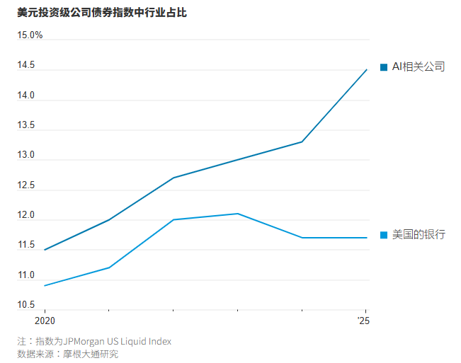 在高评级的所谓投资级债券市场中,摩根大通(JPMorgan Chase)信用债研究策略师认为“与AI革命关系最密切”的发行人群体,目前在摩根大通的一项美元投资级公司债券指数中占比14.5%。