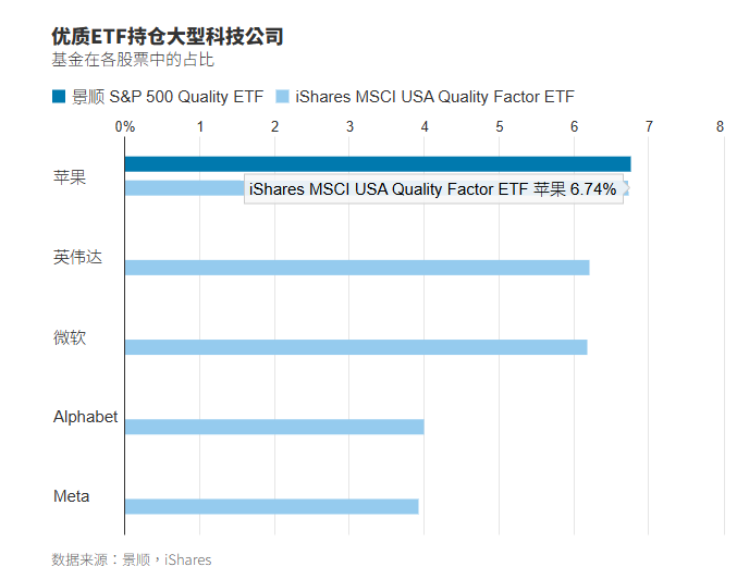 规模480亿美元的iShares MSCI USA Quality Factor (QUAL)和景顺(Invesco)旗下规模150亿美元的S&P 500 Quality (SPHQ)专门投资于投资行业所称的优质公司。这两只ETF只投资于那些在包括高盈利能力和低杠杆率在内的财务指标上表现出安全和稳健的公司。