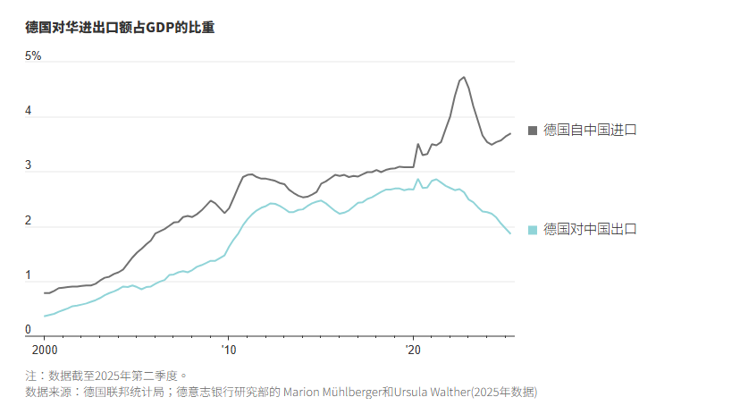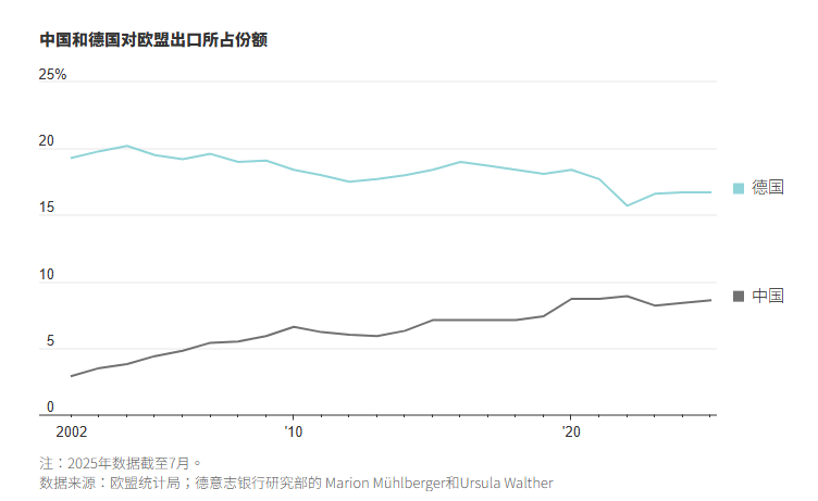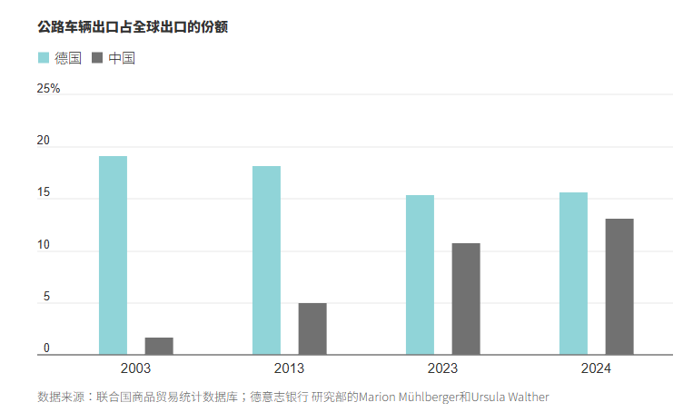 这一趋势正在加速:根据德国经济研究所(German Economic Institute)的数据,在2025年第二季度,从中国进口的手动变速箱几乎增长至原来的三倍。德国汽车制造商在中国的市场份额在两年内从一半降至三分之一。