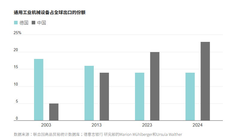 中国从投资品买家到制造商的转变速度惊人。根据智库荣鼎(Rhodium)即将发布的一份报告中的数据,在2019年至2024年间,德国在发电设备和机械领域的全球市场份额领先地位被中国夺走。