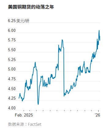美国铜价去年上涨41%,2026年已进一步走高,上周一在纽约收于每磅5.9245美元的纪录高点。特朗普宣布对铜制品加征50%关税——但金属铜不在征税范围内Feb.
