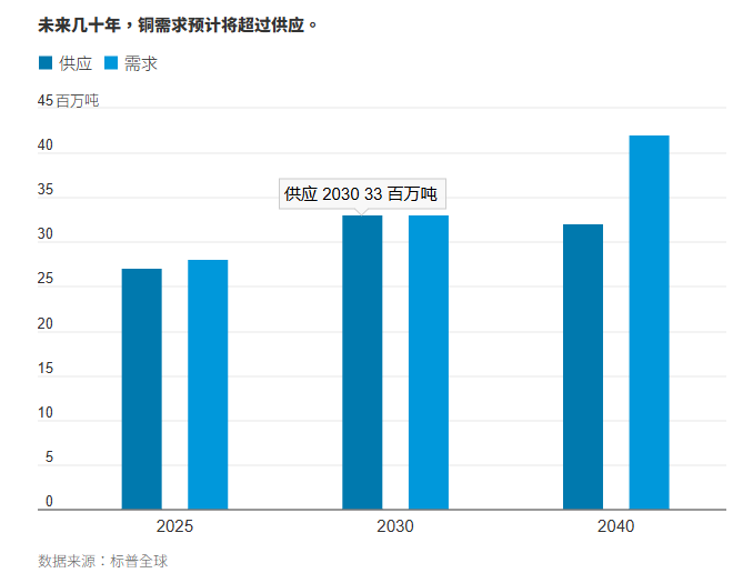 标普全球预计,到2040年,铜需求将激增至4,200万吨,比当前水平增加50%。