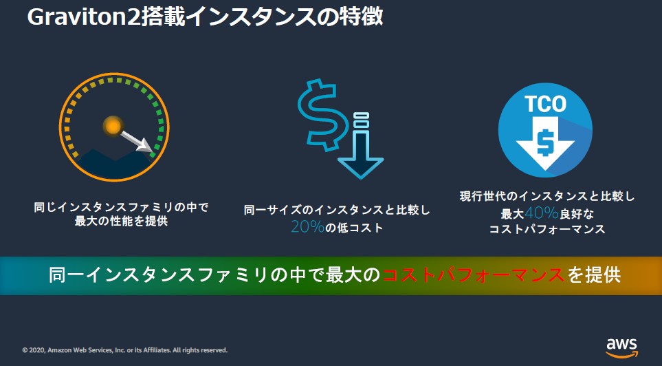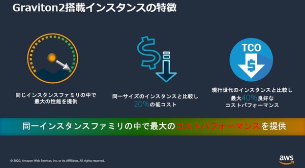 2月18日に提供を開始した「AWS Graviton 2」は、AWSが設計したARMベースのプロセッサの現行世代である(図3)。x86 CPU(Intel/AMD)のインスタンスと比べて、性能あたりの利用料金が安くつくとしている。各種Linuxが動作し、開発環境もAWSが提供するサービスはほとんどのものを利用できるとしている。図3:AWS Graviton 2のメリット(出典:アマゾンウェブサービスジャパン)